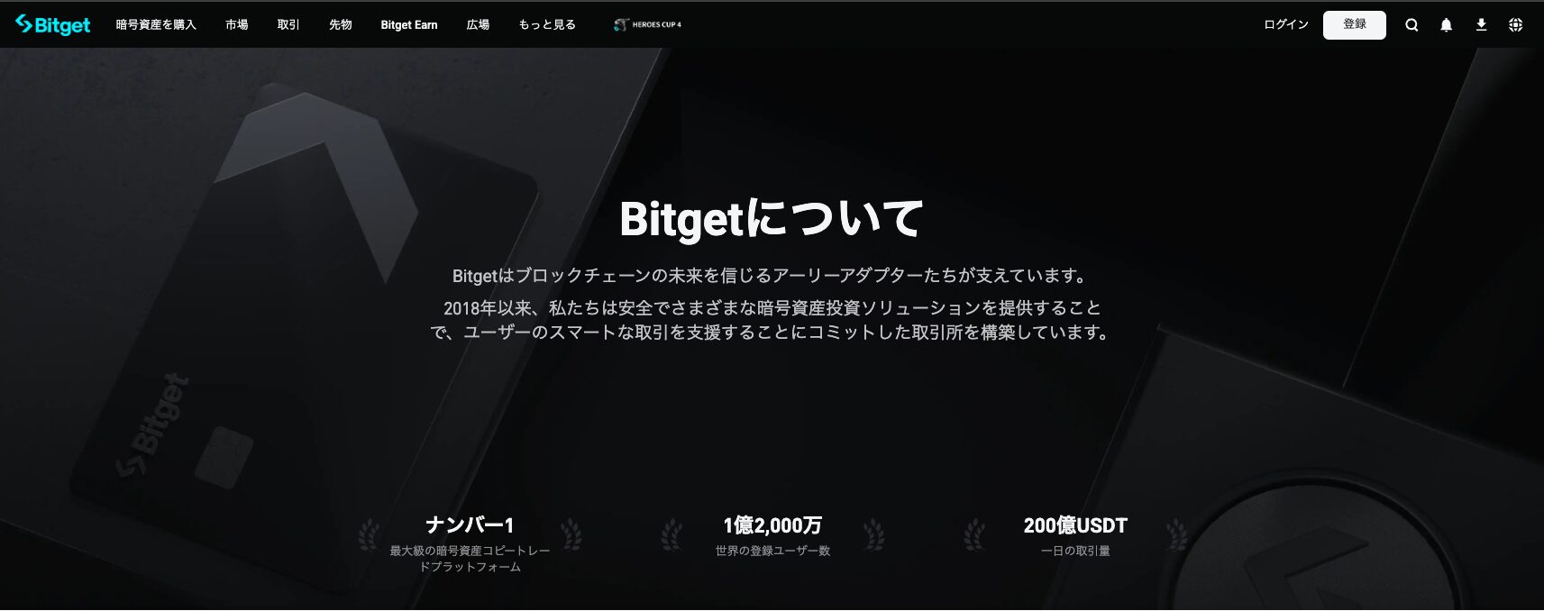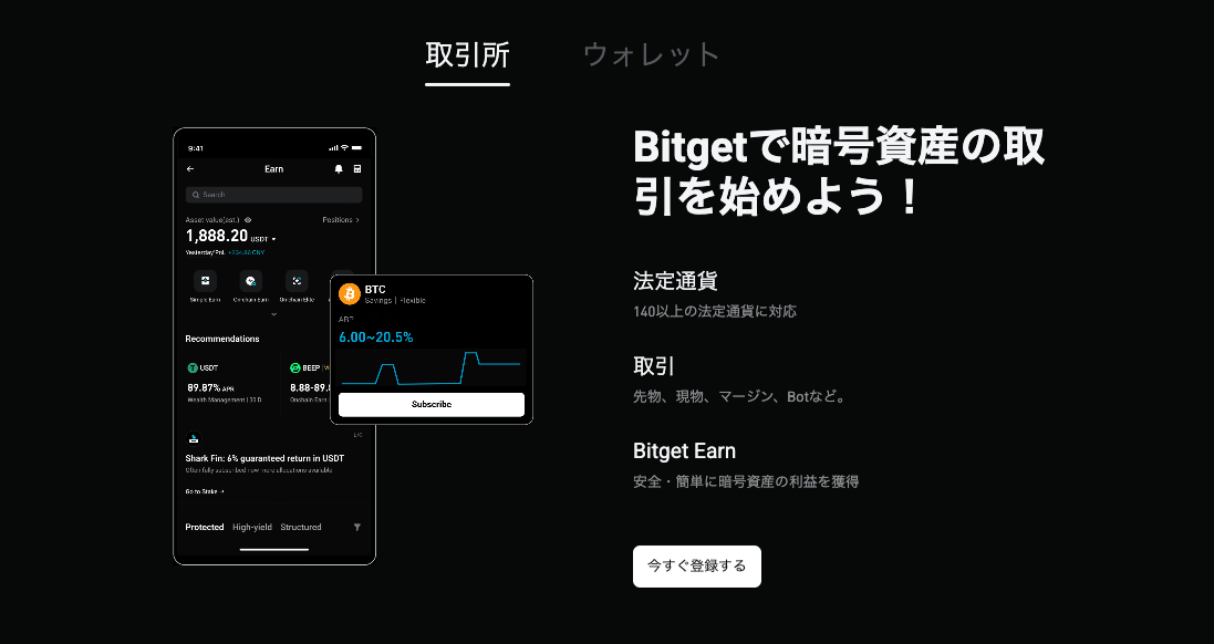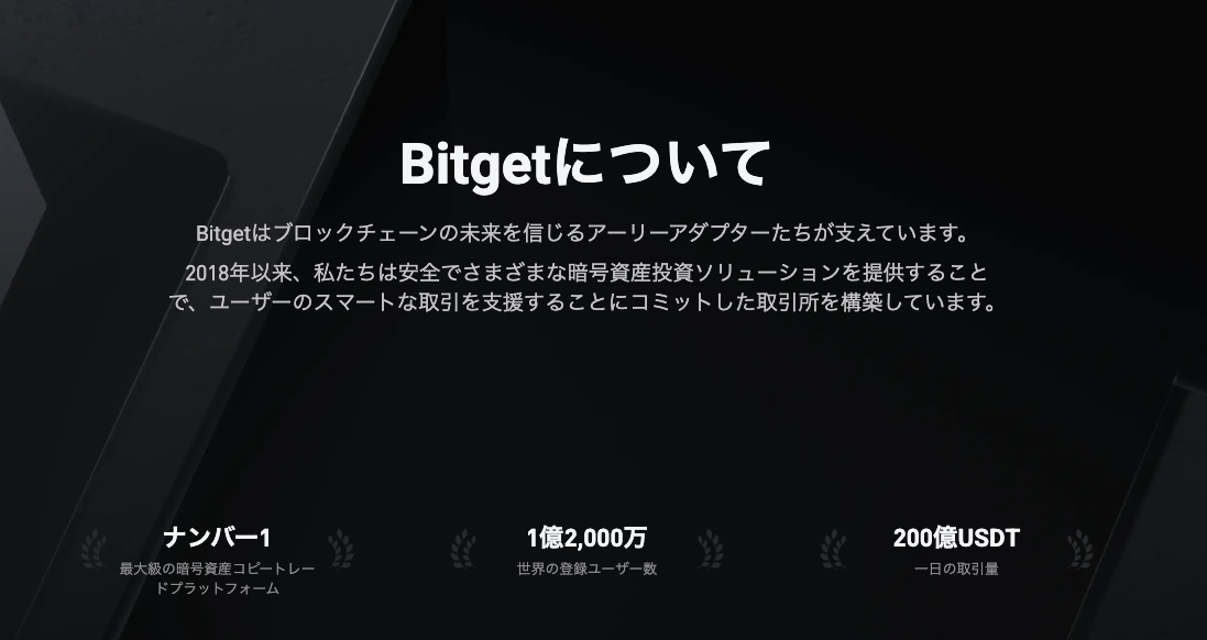 Bitget(ビットゲット)は、世界100カ国以上で3,000万人を超えるユーザーが利用している大手海外暗号資産取引所です。