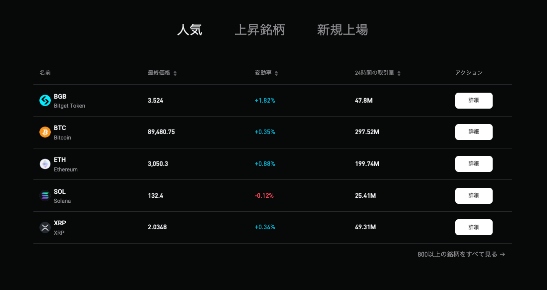 Bitgetでは、ビットコイン(BTC)やイーサリアム(ETH)といった主要銘柄以外に新興アルトコインや草コイン・話題のミームコインまで、700種類以上の暗号資産を取引可能です。