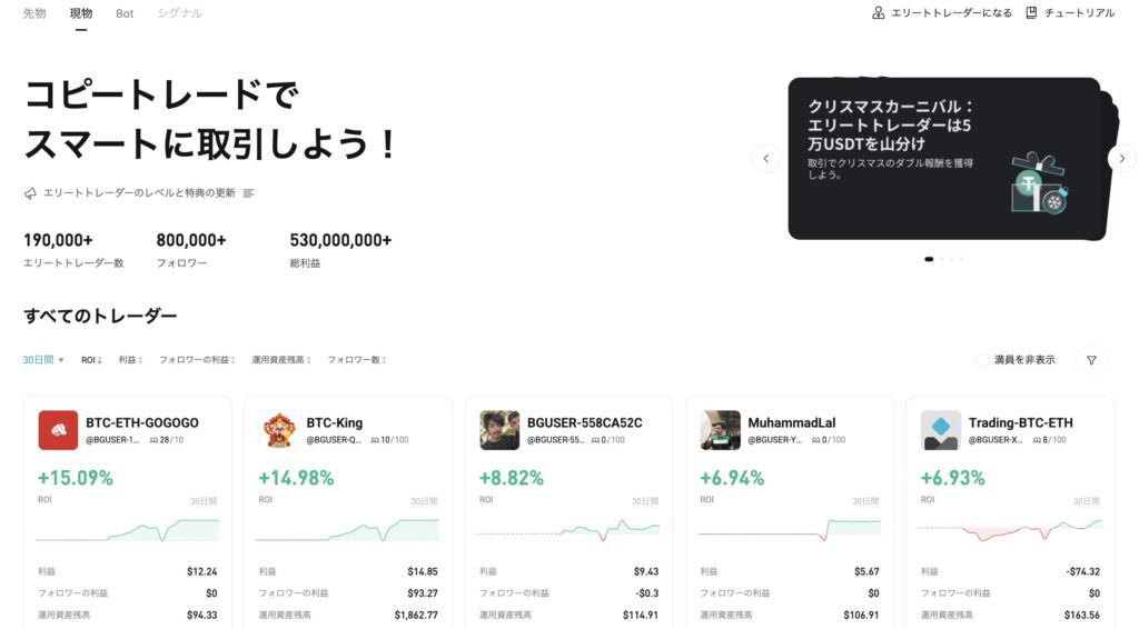 特に先物コピートレードは収益率が高いトレーダーが多数登録しており、成績やリスク管理方法を確認してフォローできるため、初心者でも比較的安全に利用できる仕組みが整っています。