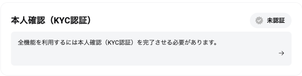 本人確認(KYC認証)は、ダッシュボード内の「全機能を利用するには本人確認(KYC認証)を完了させる必要があります。」を選択します。