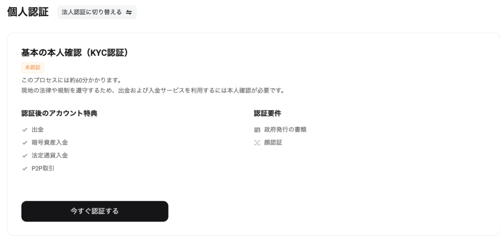 2024年1月1日から、暗号資産の入金や取引などのコアサービスにアクセスするには本人確認が必要になりました。これらの機能を引き続き使用するには、本人確認を行う必要があります。
