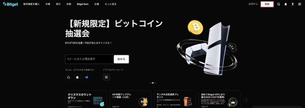 Bitget公式サイトへアクセスし、右上メニューの「登録」を選択します。